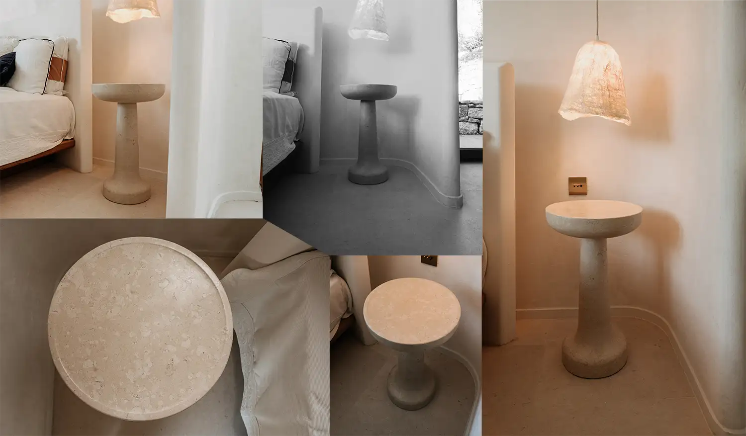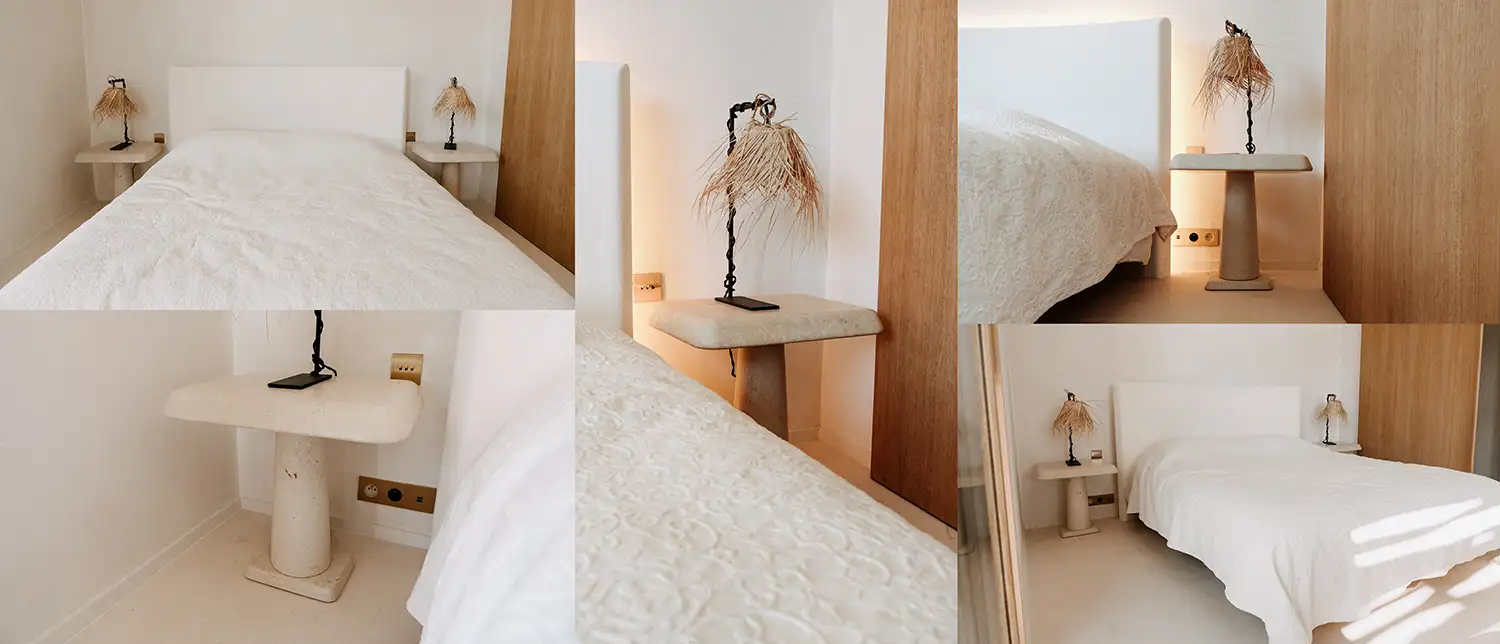 Les chevets rectangulaires conjuguent force minérale et légèreté avec une justesse évidente. Le plateau, aux bords délicatement arrondis, semble flotter sur un pied central cylindrique, comme en suspension. François Champsaur joue avec les proportions pour révéler une pièce épurée, où la douceur du grain de la pierre dialogue avec l’intimité feutrée de la chambre.
