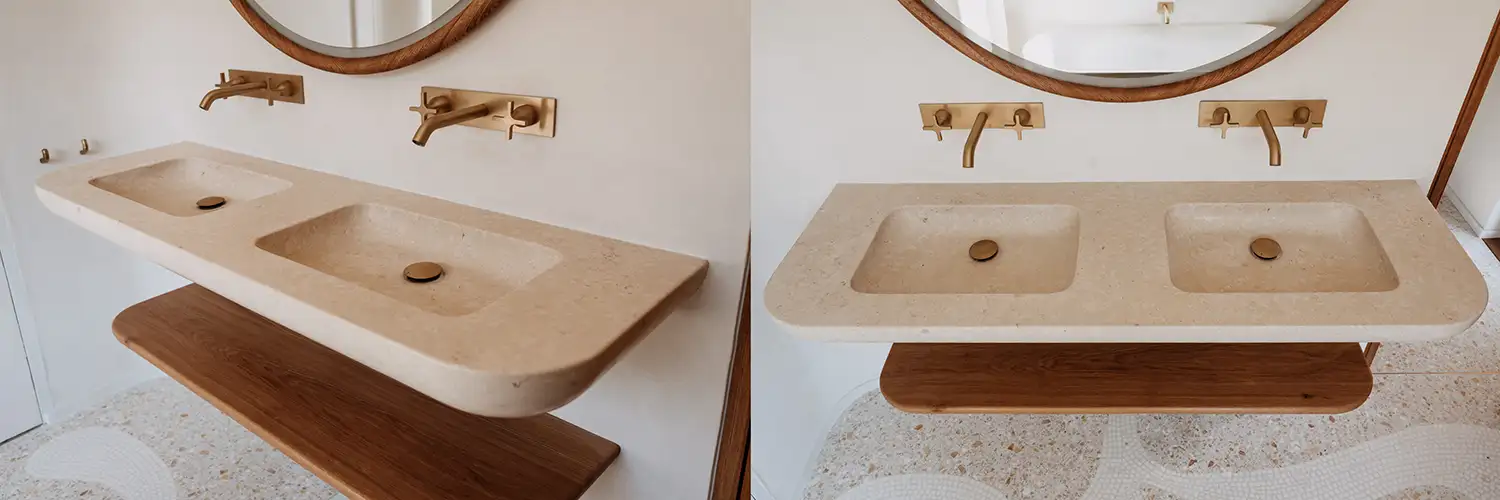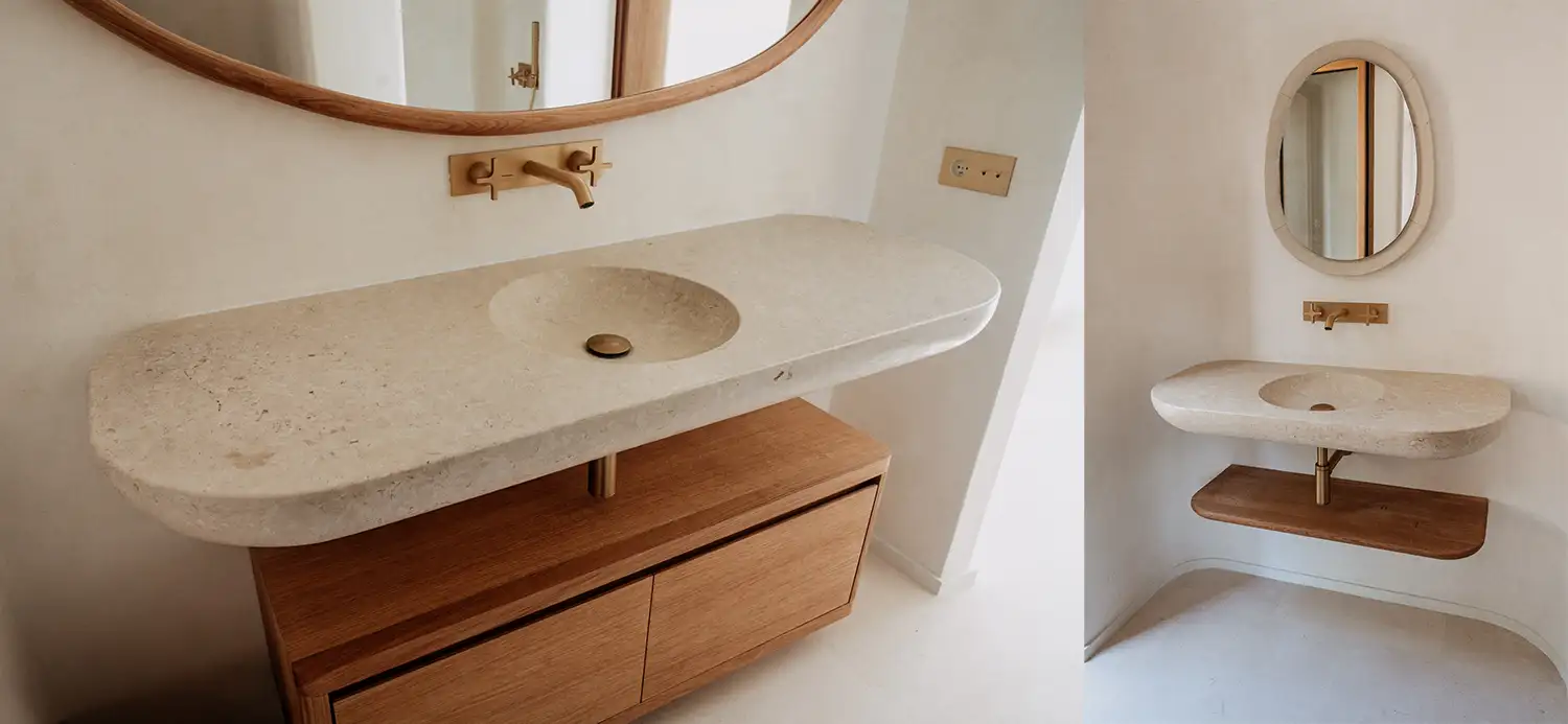 Un duo en harmonie. François Champsaur décline son geste organique avec cette Double Vasque flottante, sculptée dans une pierre au grain subtil. Les formes douces, polies, invitent au toucher, tandis que le contraste avec la tablette en bois texturé et l’éclat mat du laiton brossé crée un dialogue tactile et visuel d’une rare élégance.