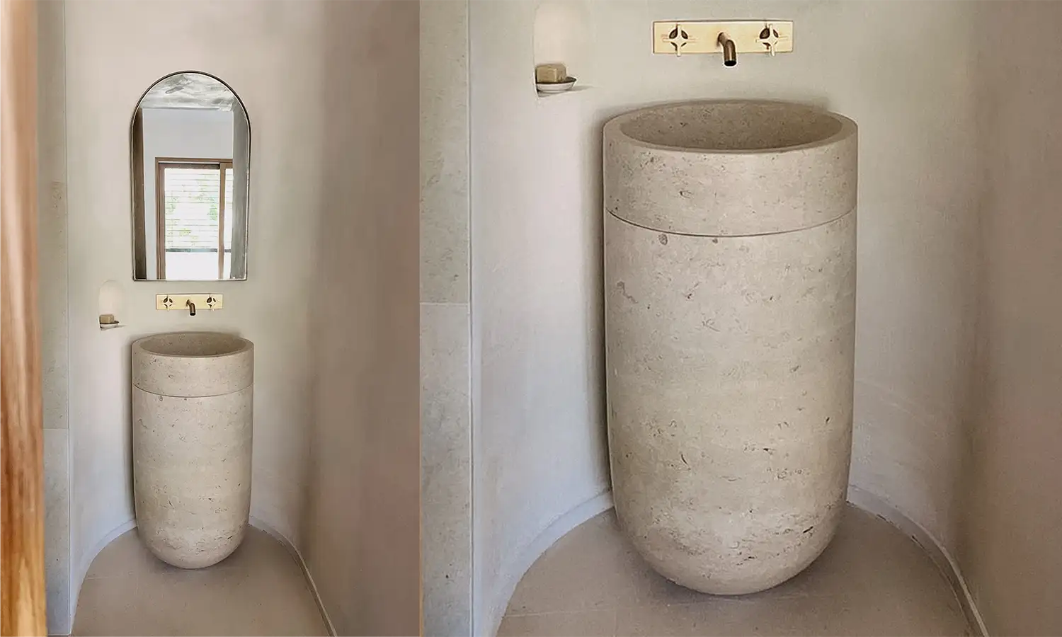 Cette pièce affirme une présence monolithique. La Vasque colonne s’élève du sol comme un bloc sculpté d’un seul tenant. On retrouve ici l’élégance d’une géométrie pure : un cylindre aux parois épaisses qui met en avant la densité et la texture naturelle du matériau. C’est une pièce structurelle, ancrée, qui définit à elle seule l’espace qu’elle occupe.